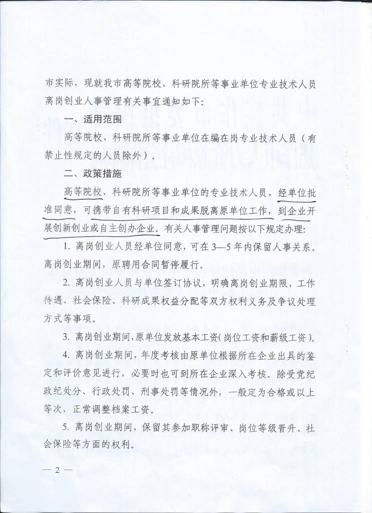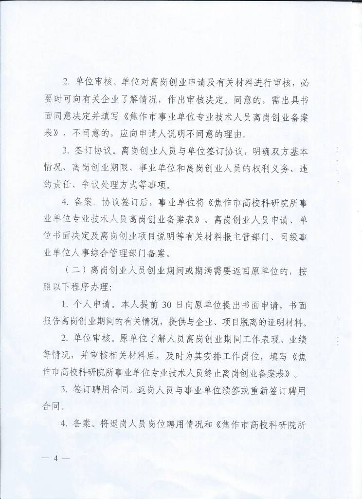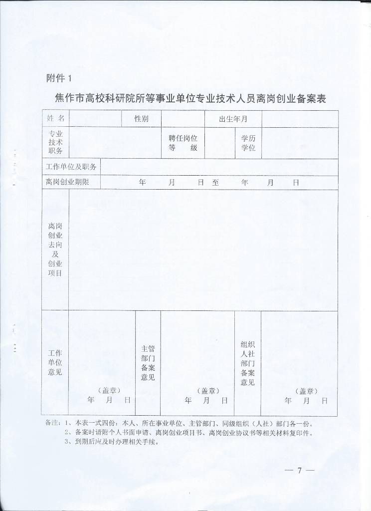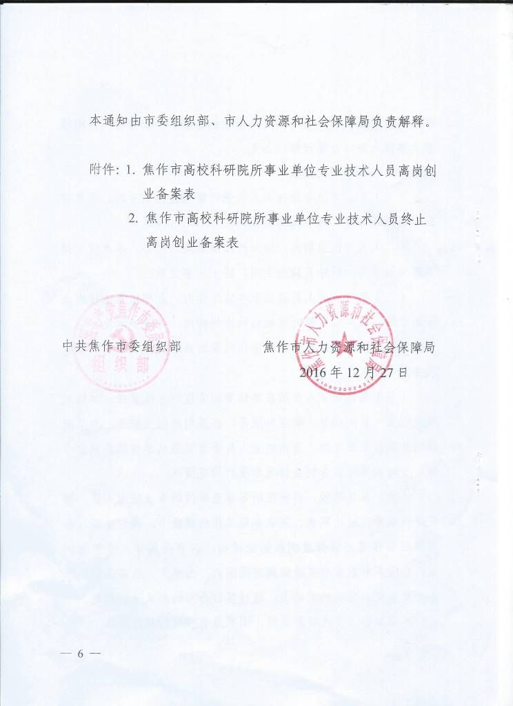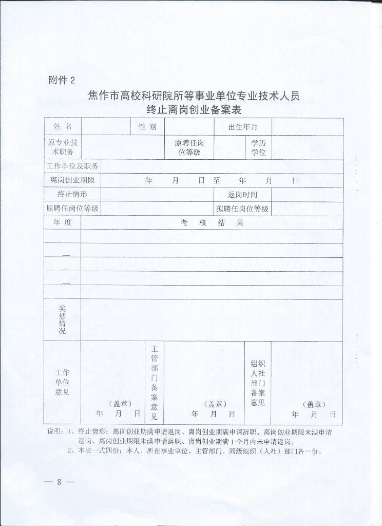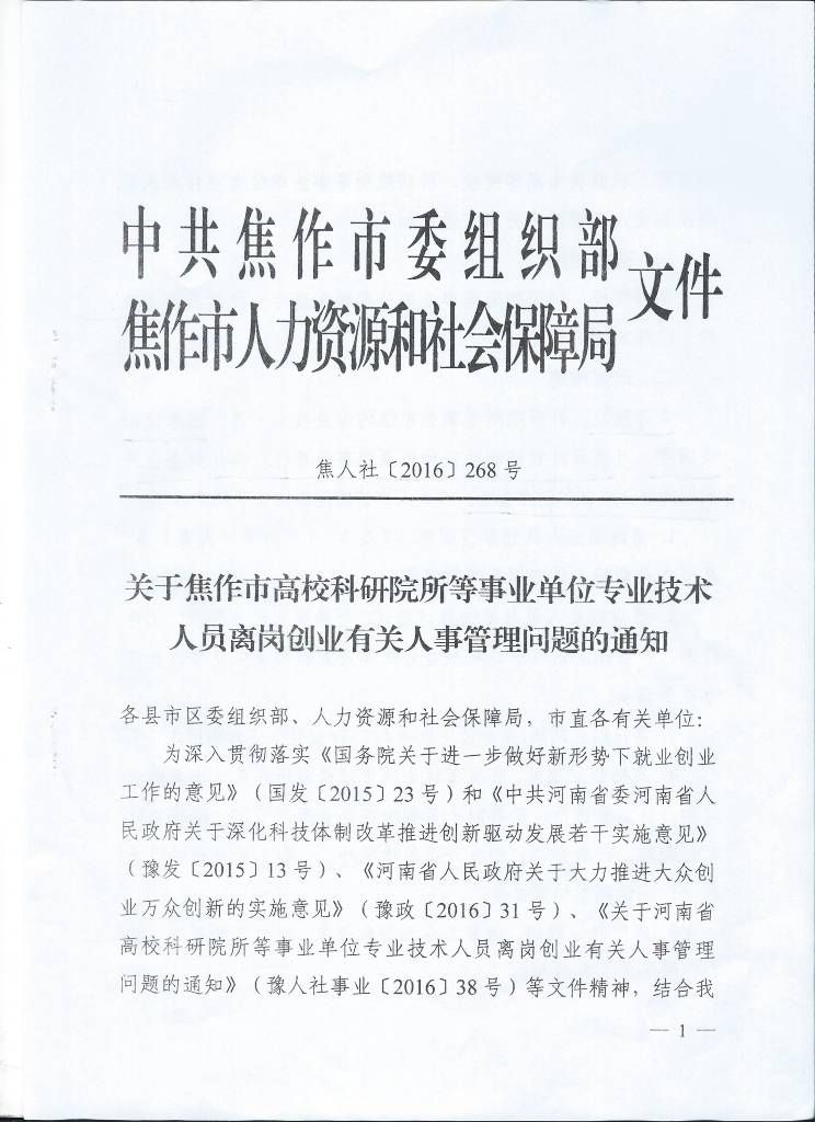 转发中共焦作市委组织·焦作市人力资源和社会保障局文件《关于焦作市高校科研院所等事业单位专业技术人员离岗创业有关人事管理问题的通知》