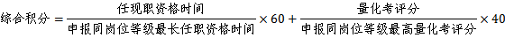 (1)参加同一岗位等级晋级的人员,按取得现任职资格时间长短占60%,量化考评分占40%(具体量化评分标准见附件1、附件2),进行综合积分。具体折算公式为: